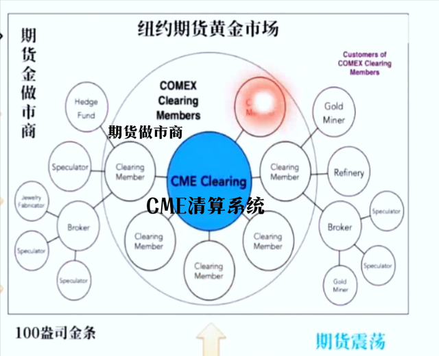 纽约的期货金市场,中心就是CME的清算系统,在清算系统周围是那些核心的做事商,这些核心做事商叫期货做事商,他们跟伦敦实物做市商都是一伙人,都是华尔街大银行,包括汇丰银行,还有伦敦的一些最主要的银行。