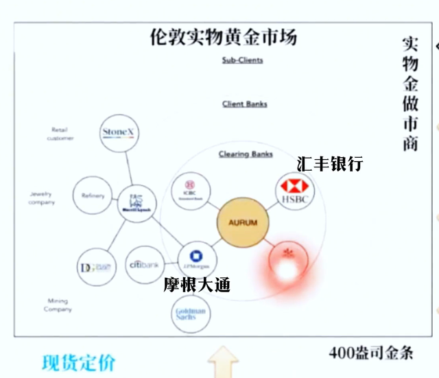 伦敦主要是做黄金的实物交易,如果我们看它的交易结构,看它整个的市场组成结构,你会发现它的核心机构,或者叫清算中心,连接若干个最主要的黄金做市商。有摩根大通、汇丰银行等等,这些叫黄金做市商。